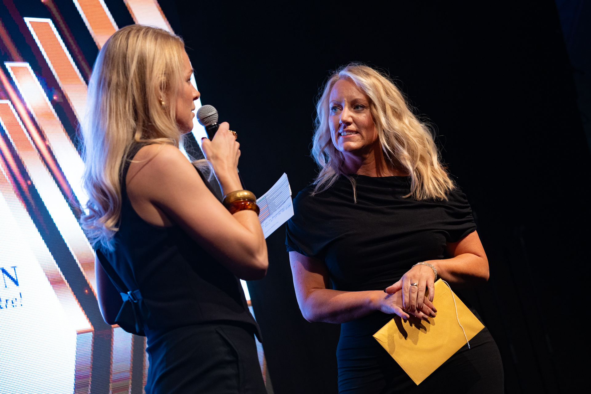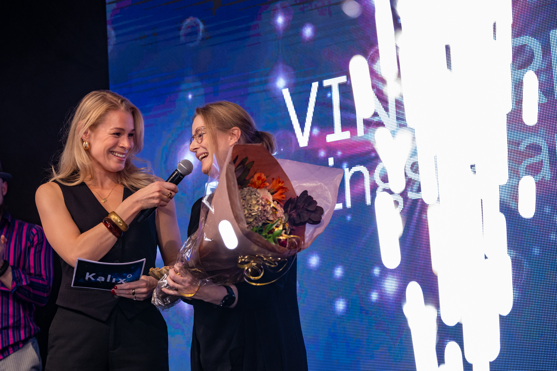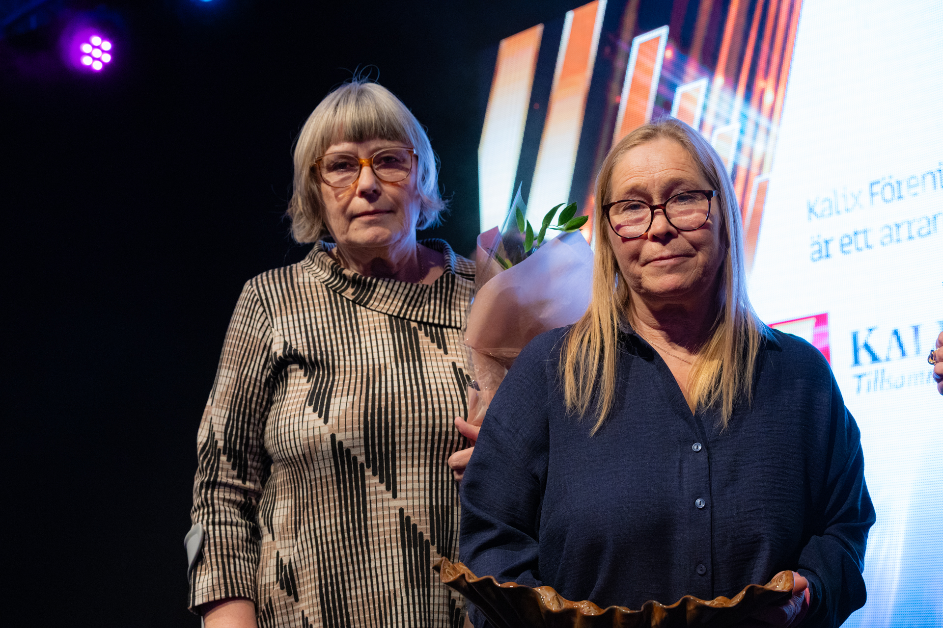 Konferencier Jennie Öberg gratulerar Linda Erikshammar till priset som Årets Eldsjäl.