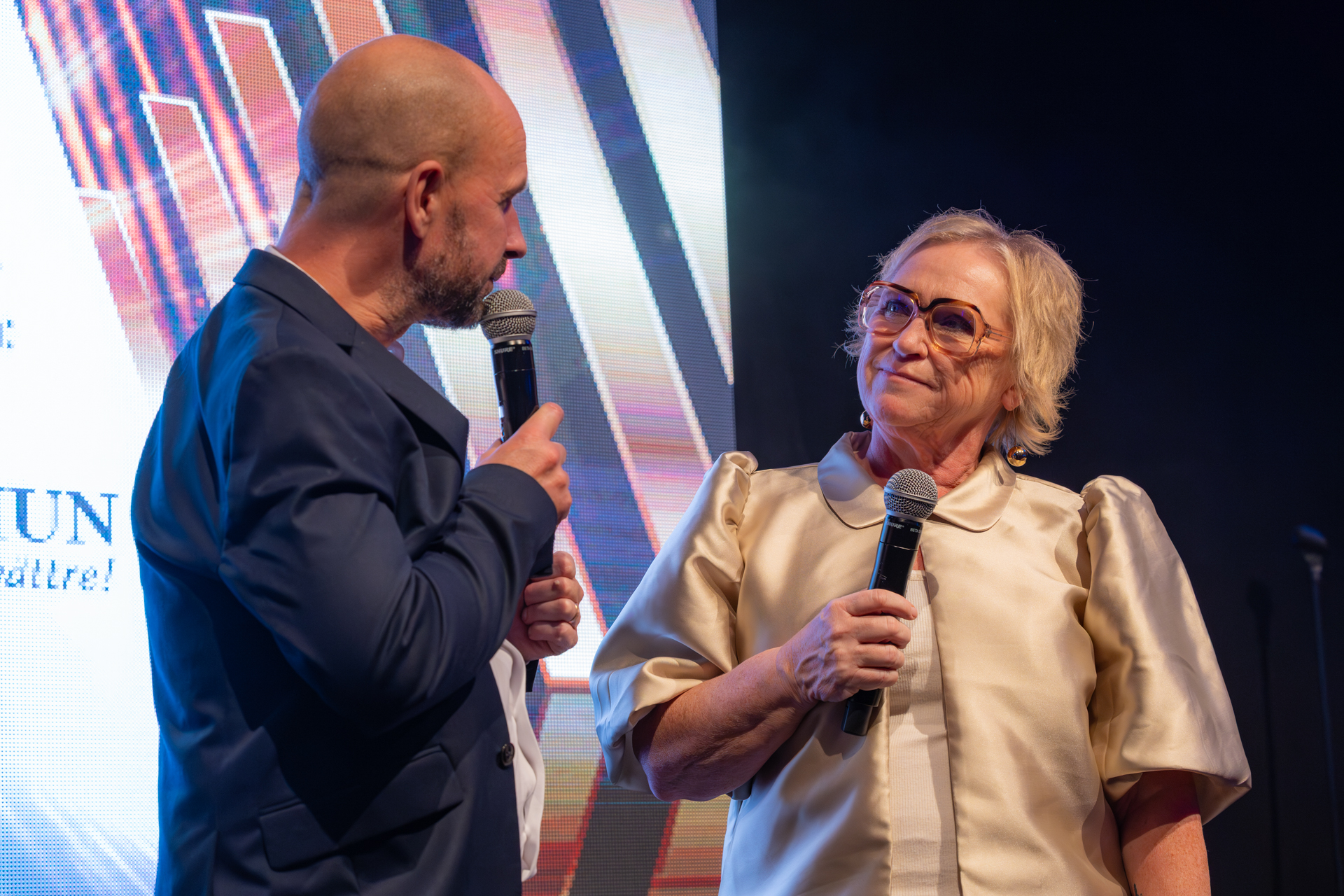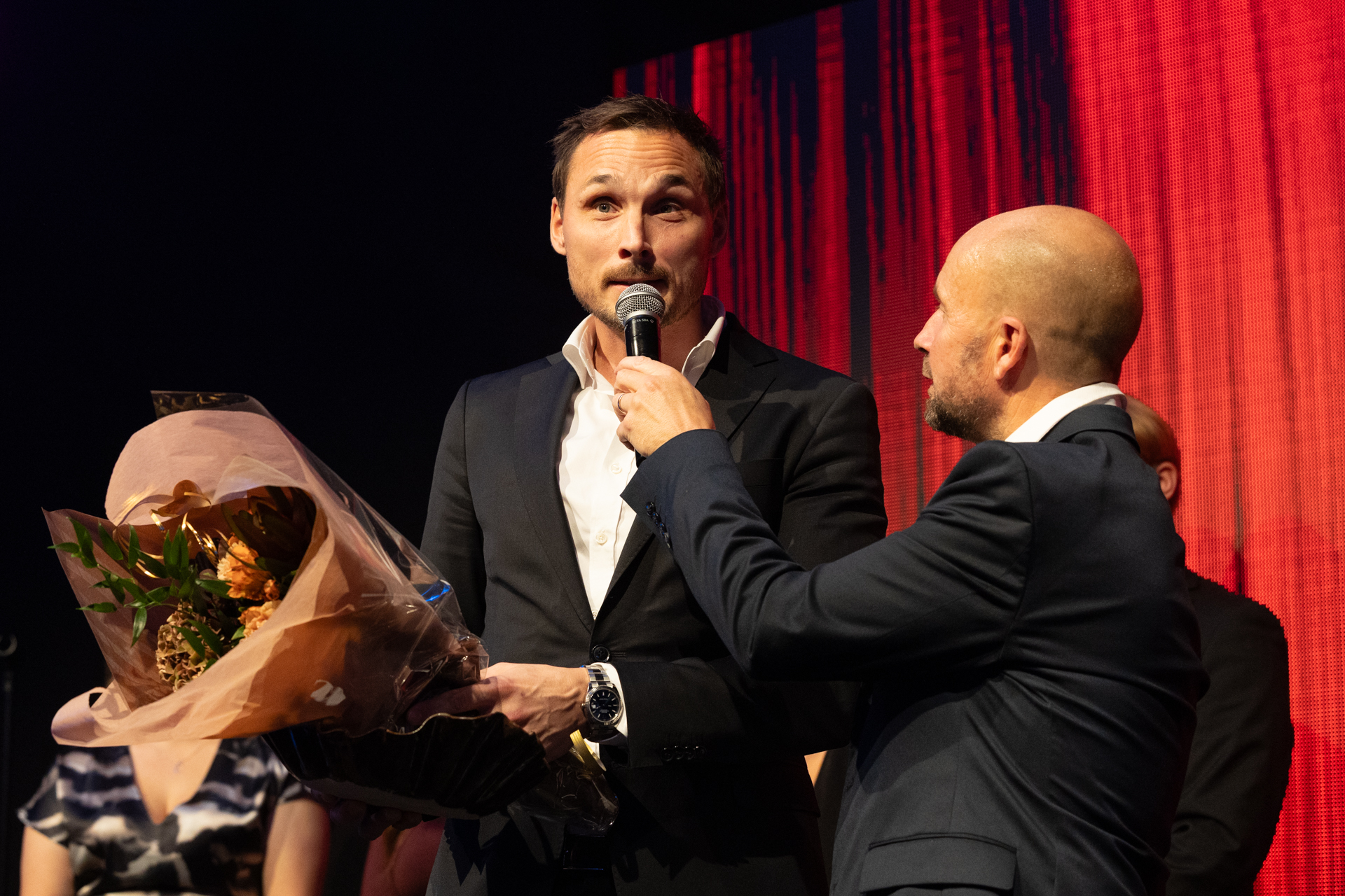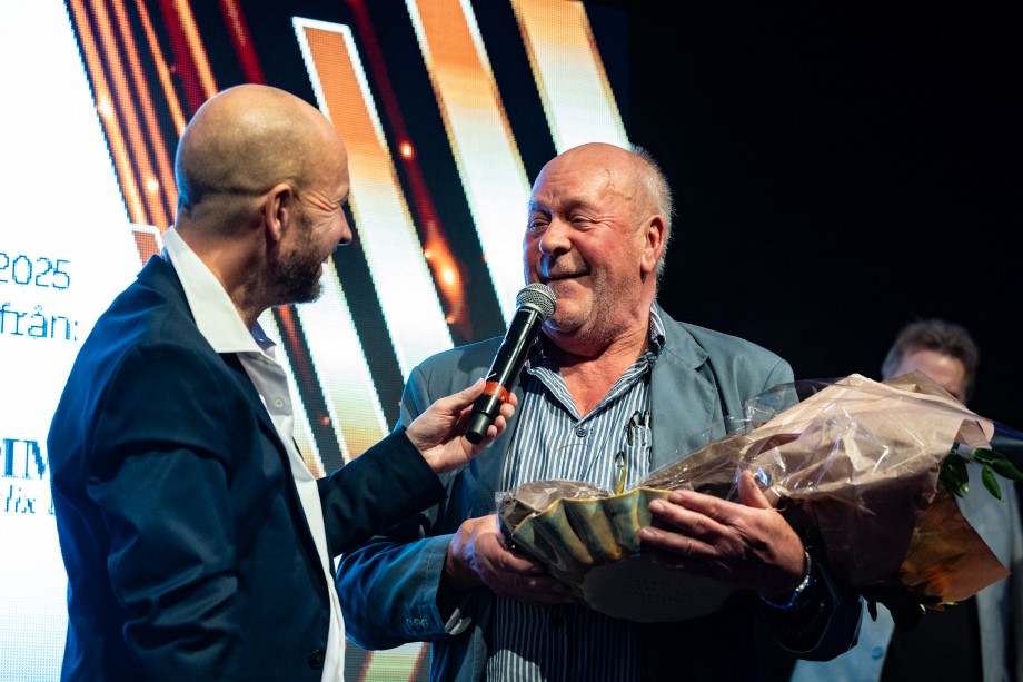 Konferencier Reine Sundqvist gratulerar en sprudlande glad Kjell Morin till Årets Hederspris.