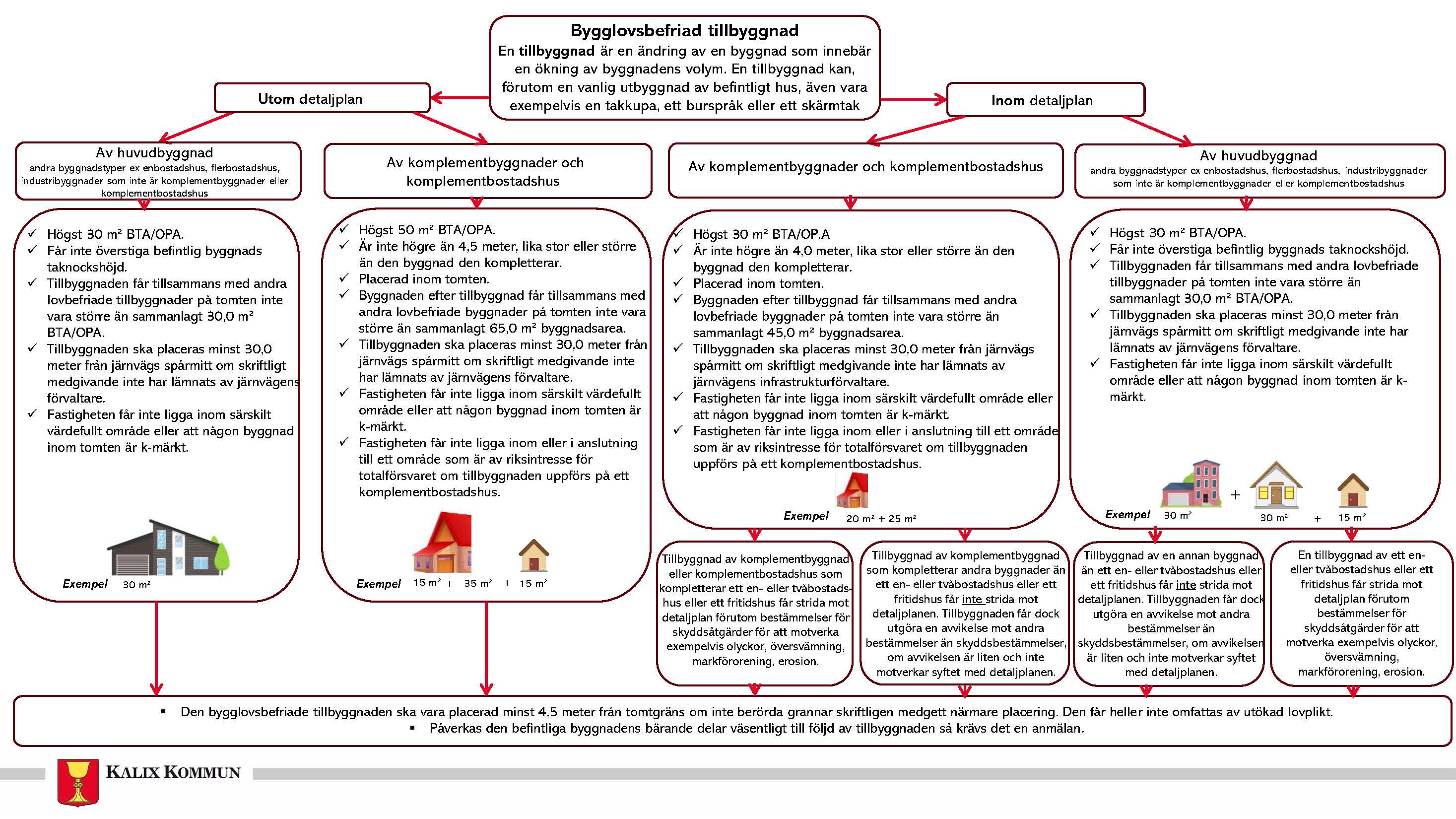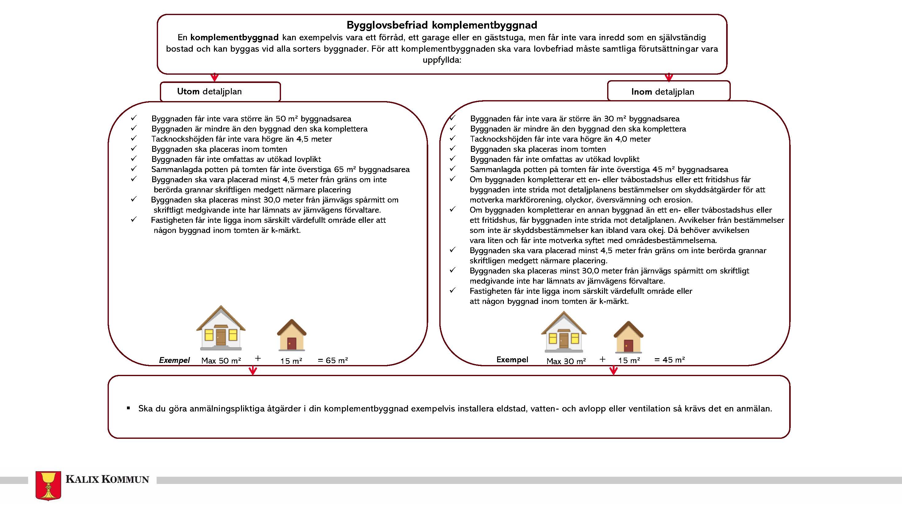 Det kan till exempel handla om att du vill bygga en komplementbyggnad eller en tillbyggnad. Från och med 1 december 2025 blir flera åtgärder som tidigare krävt bygglov bygglovsbefriade. De tidigare åtgärderna Attefallshus, Attefallstillbyggnad och Friggebod har ersatts med vissa bygglovsbefriade åtgärder. Varje fastighet har en pott för komplementbyggnader och en pott för tillbyggnader. Pottens storlek och byggnadernas maxhöjd bestäms av om fastigheten ligger inom ett detaljplanerat område eller utanför. Med ”sammanlagda potten på tomten” menas den sammanlagda arean som räknas in av samtliga byggnader som nu och tidigare inte har omfattats av krav på bygglov ex. Attefallhus och friggebod. Exempelvis om din fastighet ligger inom detaljplanerat område och du sedan tidigare har uppfört en friggebod på 15 kvadratmeter och ett attefallshus på 30 kvadratmeter, har du redan nyttjat din lovbefriade pott. Det innebär att du behöver ansöka om bygglov för ytterligare komplementbyggnader.